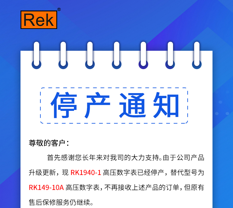 日期:2022-08-11由于公司產(chǎn)品升級更新,現(xiàn)RK1940-1 高壓數(shù)字表已經(jīng)停產(chǎn),替代型號為 RK149-10A高壓數(shù)字表,不再接收上述產(chǎn)品的訂單,但原有售后保修服務(wù)仍繼續(xù)。 請各經(jīng)銷商,新老客戶相互轉(zhuǎn)告,因上述問題帶來不便,敬請諒解!如有其他疑問可撥打我司服務(wù)熱線 400-876-9388