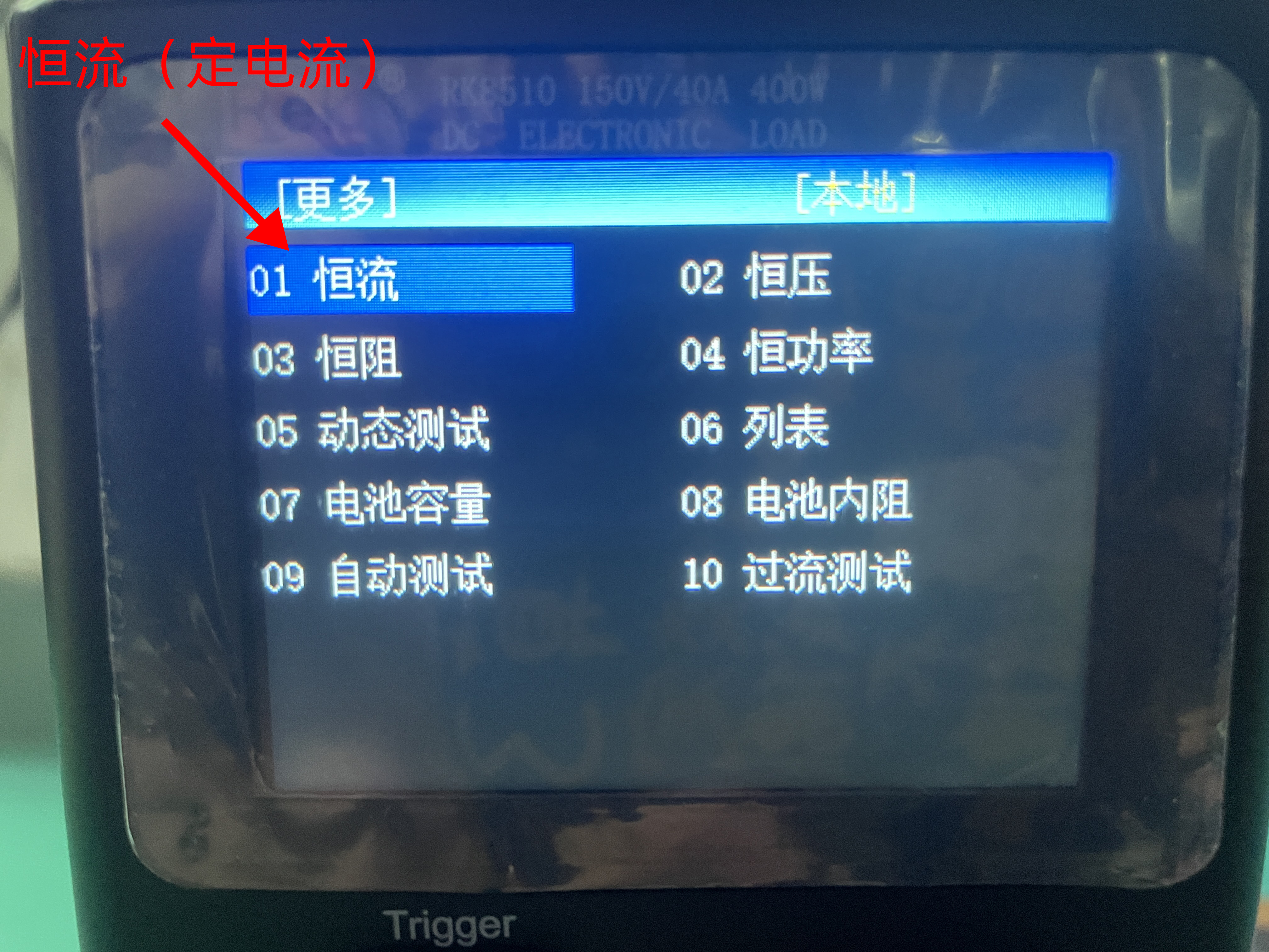 接線完成打開(kāi)儀器,點(diǎn)擊Mode按鍵,進(jìn)入產(chǎn)品的模式選擇界面,RK8510擁有定電流、定電壓、定電阻模式,通過(guò)方向按鍵選擇對(duì)應(yīng)模式,首先我們選擇定電流模式點(diǎn)擊OK按鍵進(jìn)入定電流界面,點(diǎn)擊OK按鍵在設(shè)置欄調(diào)整電流值,調(diào)整好電流后按ON進(jìn)行測(cè)試。按相同方法可以測(cè)試定電壓、定功率功能。
